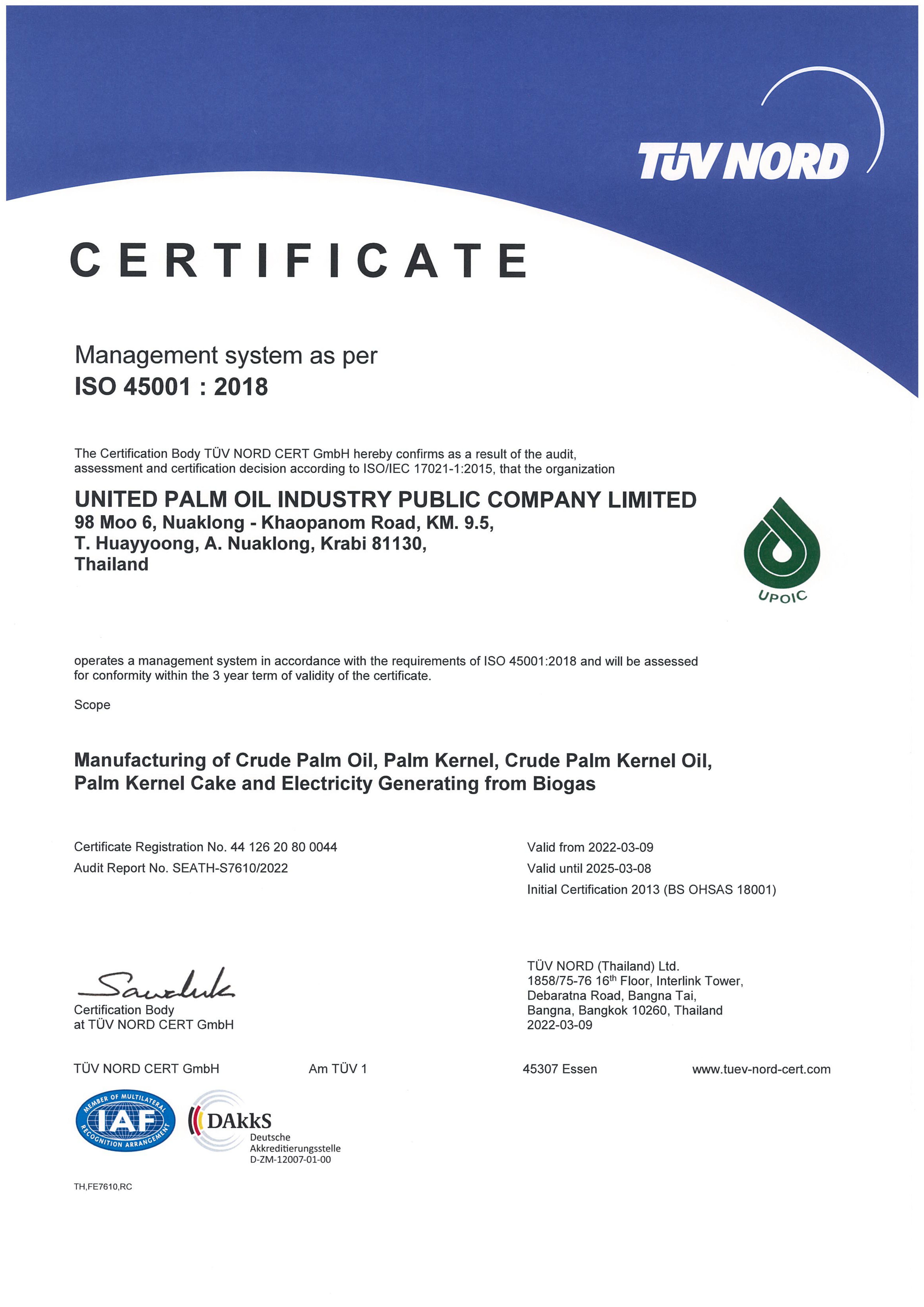 In 2013, our company were certified ISO 9001, ISO 14001,ISO 45001:2018 and Round Sustainable Palm Oil (RSPO) standard system by TUV-NORD. Because we concerned about product quality, environment preserved, safety and occupational of employee including use of appropriate best practice in our plantation and mill.